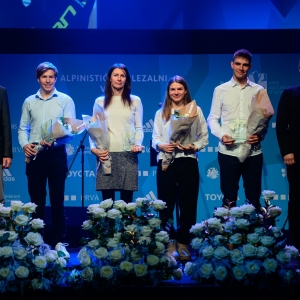 Najuspešnejša tekmovalna turna smučarja Klemen Španring in Klara Velepec, prejemnik priznanja za življenjsko delo v alpinizmu Bojan Pollak, najuspešnejši športni plezalec Luka Potočar in alpinistka Ana Baumgartner ter naj tekmovalna ledna plezalca v letu 2025 Gregor Šegel in Maja Šuštar Habjan; manjkata naj športna plezalka Janja Garnbret in naj alpinist Nejc Marčič. (foto Martin Metelko/PZS)